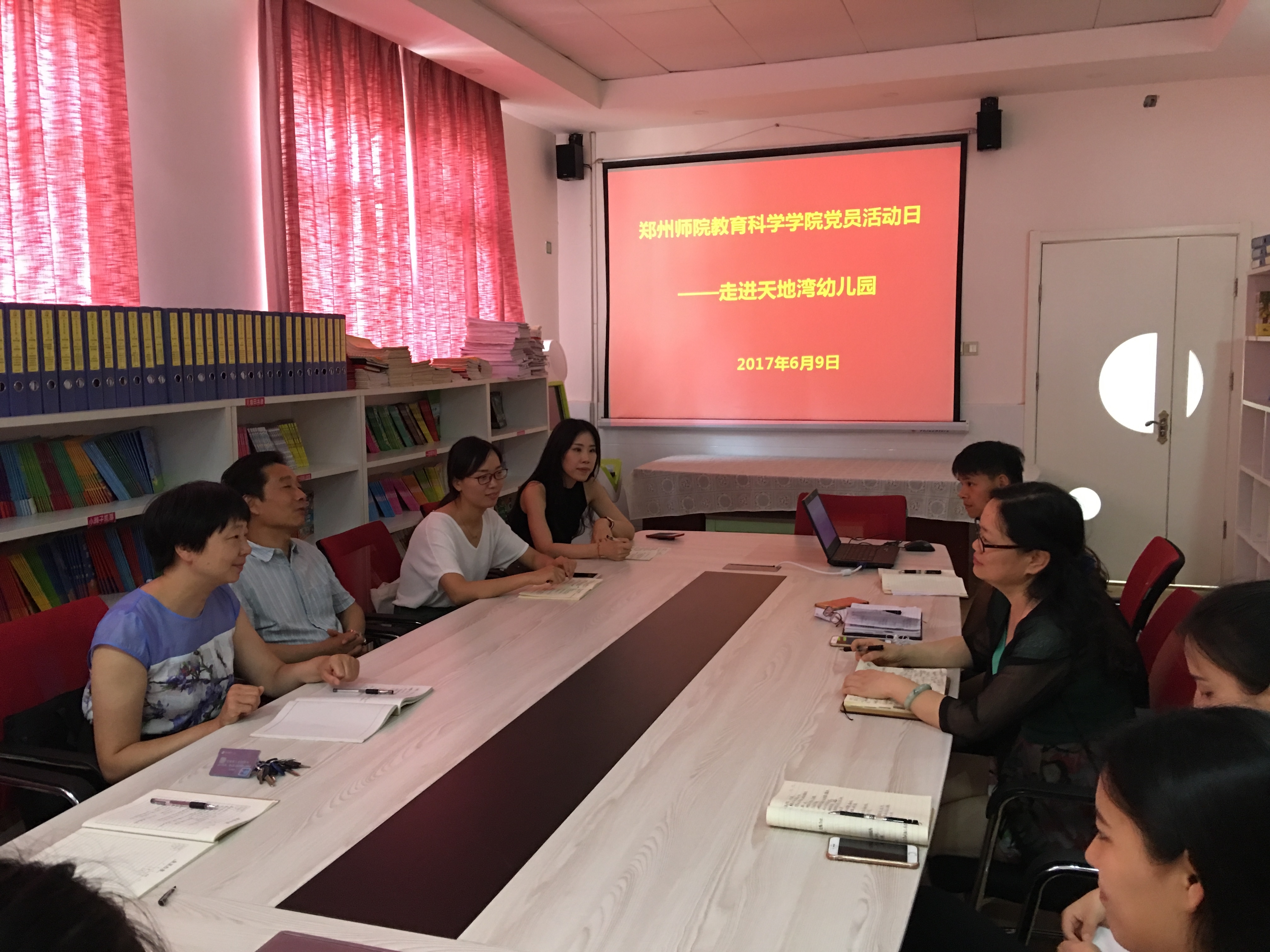 2017年6月9日上午,我院举行“走进天地湾幼儿园”教工志愿者活动。党总支书记乔春平、学前教育系主任刘颂华及我院部分教工志愿者来到郑州市教工幼儿园天地湾分园进行教学科研交流研讨活动。天地湾幼儿园的戴红梅园长亲自接待并主持了本次活动。