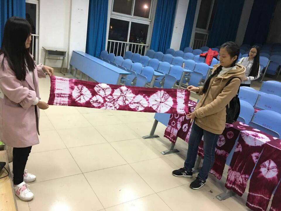 讲解之后,申老师向大家展示了往届学生的优秀作品,染色形成的痕迹美,独特的手工扎结,自然过度的色晕美统统展现在眼前,获得了在场老师和同学的一阵阵赞美。