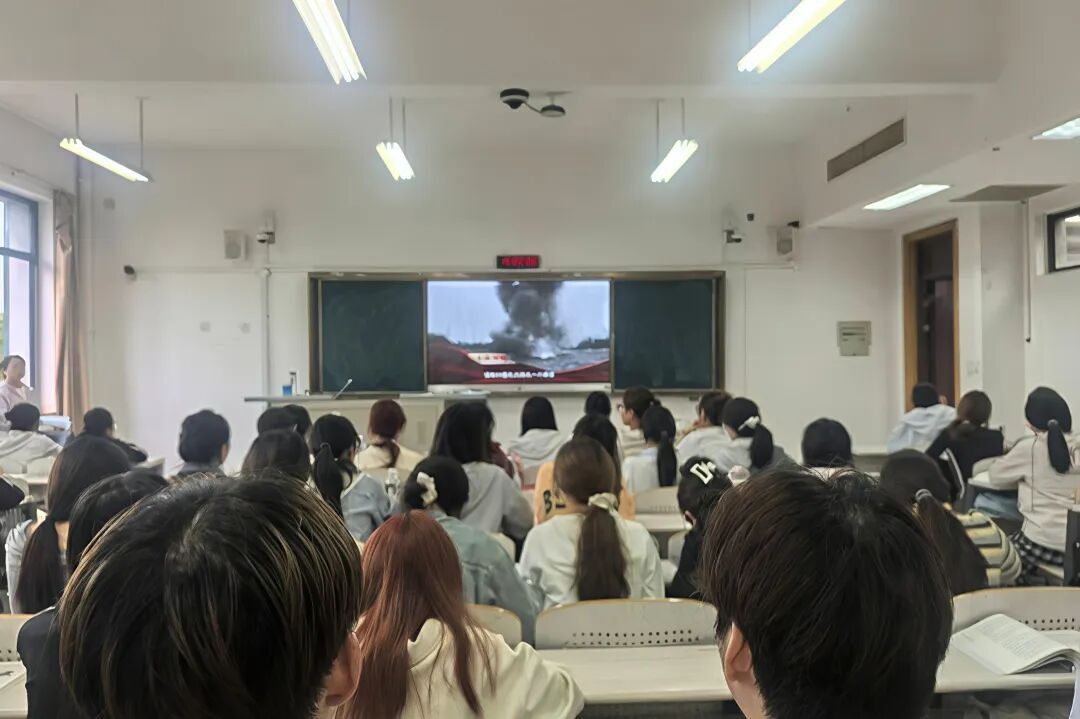 活动伊始,各班团支书组织同学们观看了抗战历史纪录片,共同重温烽火岁月,深刻感悟革命先辈不畏艰难、英勇奋斗的爱国情怀。随后,各班团支书紧扣“抗战精神与青年使命”的主题,结合历史事件与英雄事迹,生动阐述了“天下兴亡,匹夫有责”的担当精神,引导同学们深入思考民族复兴的时代命题。活动最后,全体同学面向团旗庄严宣誓,承诺将继承先辈遗志,锤炼意志品质,以实际行动践行“强国有我”的青春誓言。