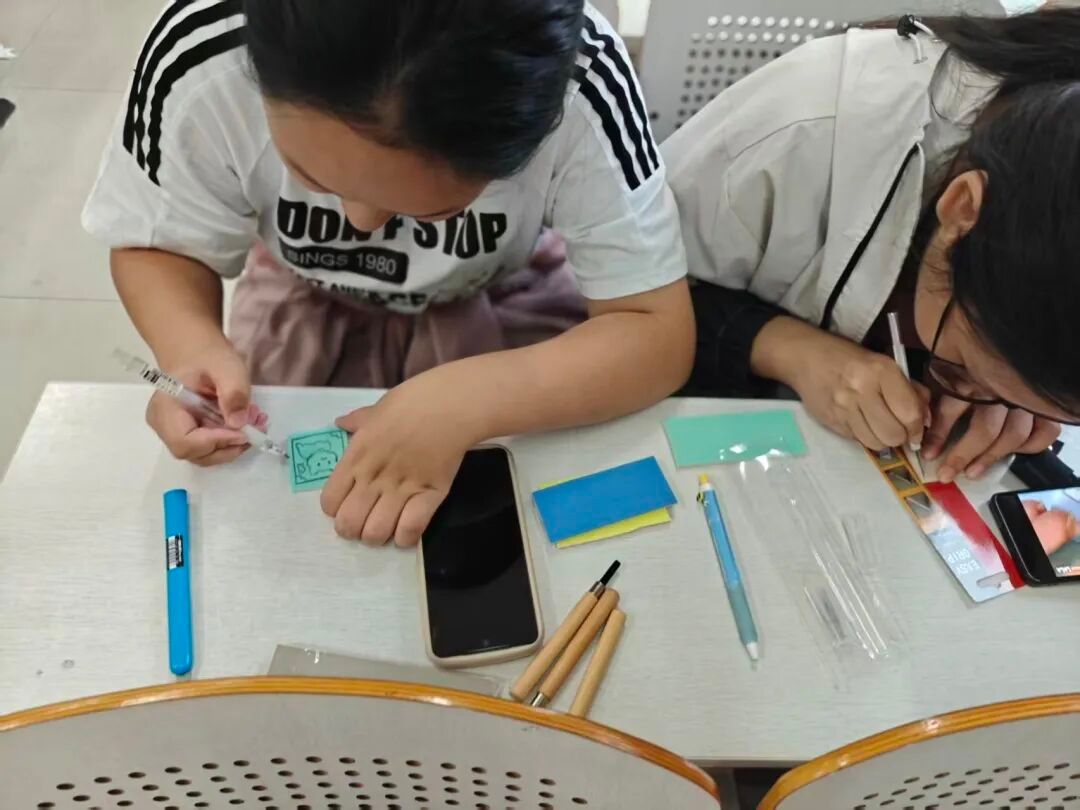 活动伊始,小老师简要介绍了篆刻艺术的历史渊源和基本技法。随后,同学们领取素材,纷纷投入创作。有的参照提供的传统图案样本,精心临摹;有的则发挥奇思妙想,将个人姓名、喜爱的诗词或具有特殊意义的符号设计成印稿。原本平平无奇的橡皮块,在同学们的巧手雕刻下,逐渐显现出文字的筋骨与图案的神韵。经过一番精雕细琢,一枚枚独具匠心的橡皮章陆续完成。