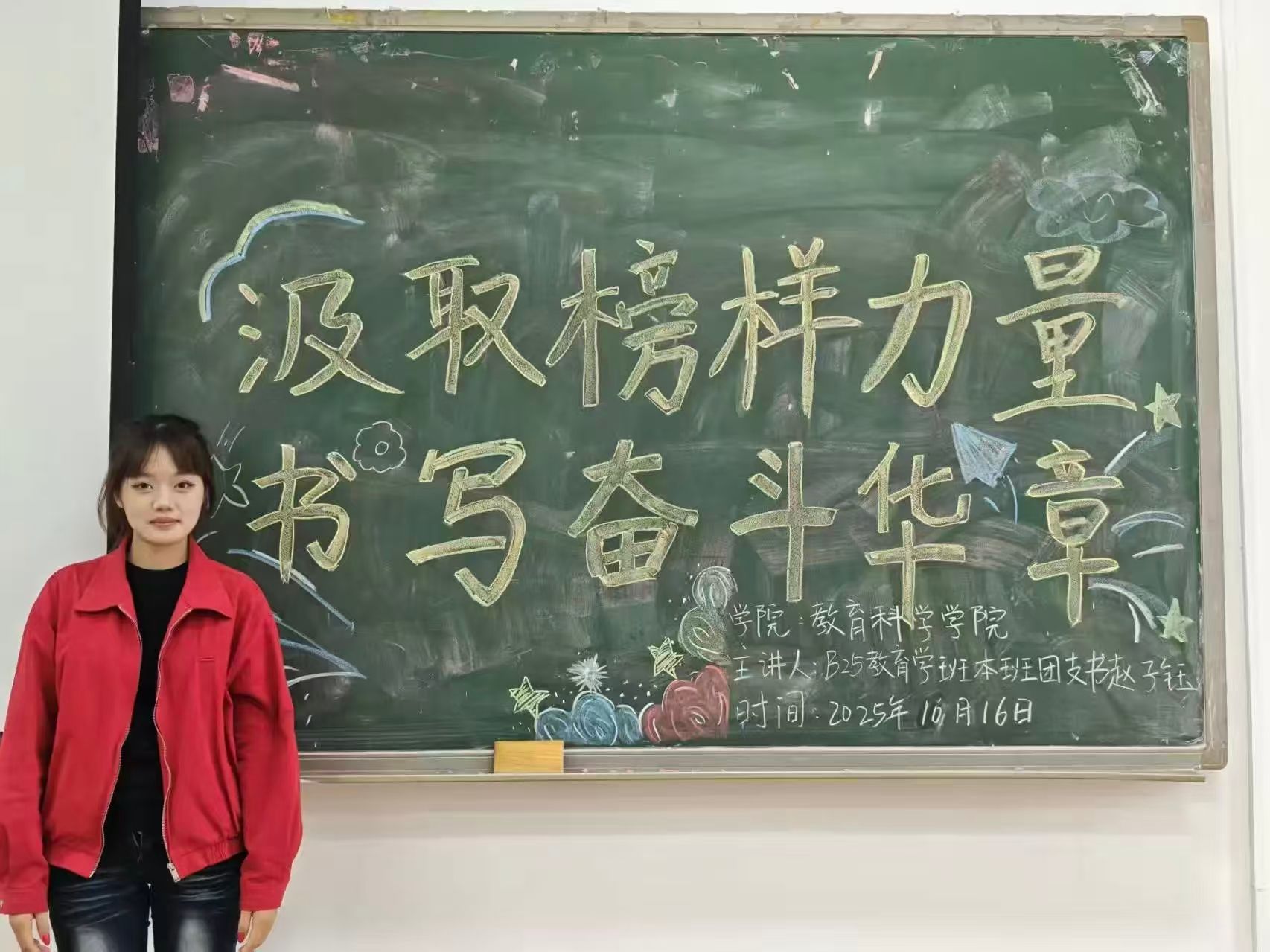 为引导青年坚定理想信念,在新时代中砥砺奋进,我院团总支组织部于2025年10月16日中午12:40在西校区一阶二教室组织开展了“汲取榜样力量,书写奋斗华章”主题团课。本次团课由B25教育学班团支书赵子钰同学主讲,我院25级全体学生参与其中。