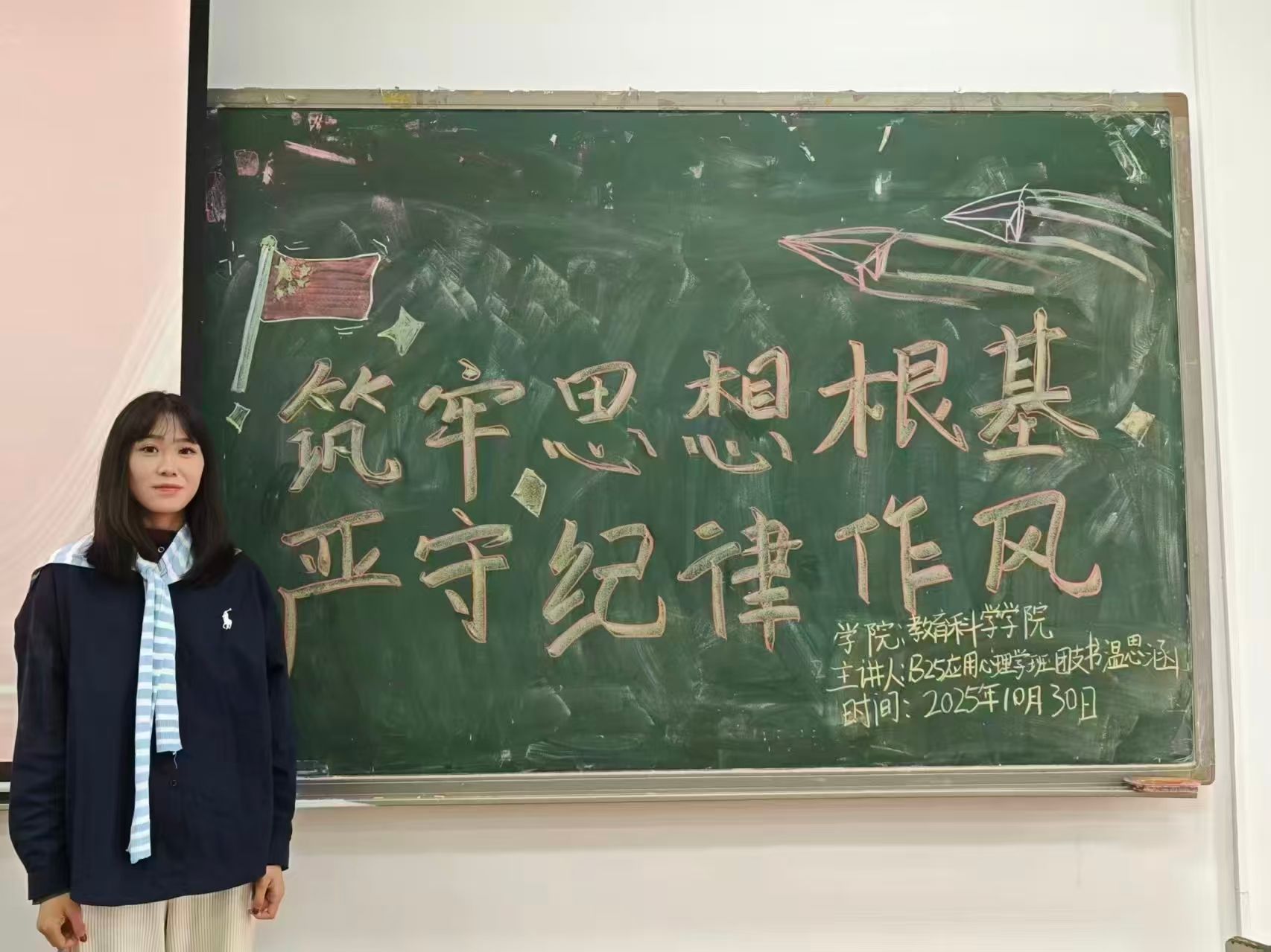 为加强同学们的思想政治引领,筑牢理想信念根基,我院团总支组织部于2025年10月30日中午12:40在西校区一阶二教室组织开展了“筑牢思想根基,严守纪律作风”主题团课。本次团课由B25应用心理学班团支书温思涵同学主讲,我院25级全体学生参与其中。