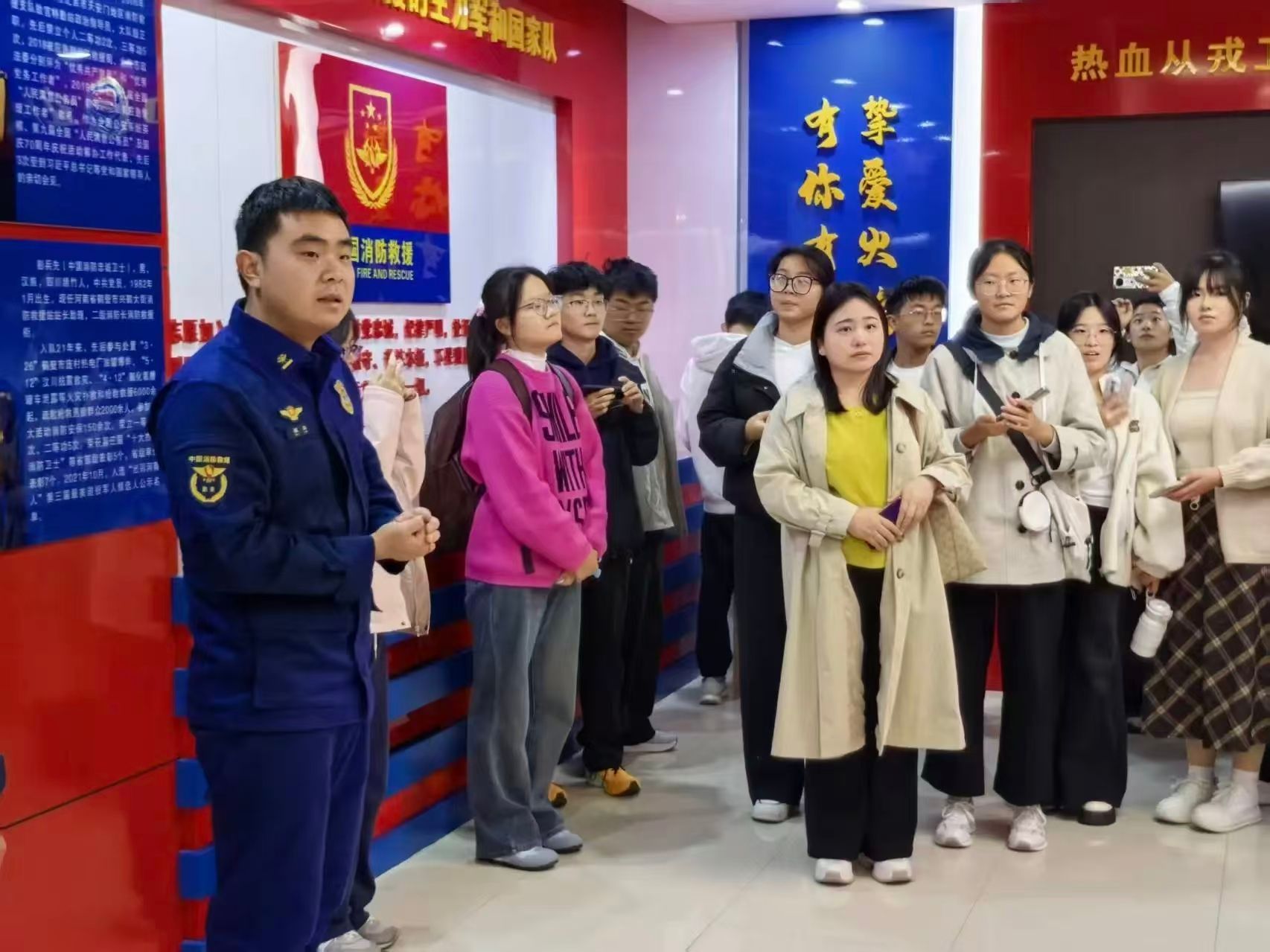 活动当天,我院45名同学在带队教师的组织下有序前往惠济区消防站。在消防指战员的专业引导下,同学们系统了解了消防车辆配置及各类消防工具的功能用途。随后,消防指战员详细讲解了专业设备的功能参数与操作规范,并带领同学们参观消防备勤室,结合实战场景介绍了各类服装的适配场景。在理论学习环节,消防指战员结合典型案例,系统讲解了不同火情下的学生自救要点与临时处置措施。在参观荣誉馆时,消防指战员讲解了“赴汤蹈火”的训词精神。同学们通过认真学习英雄事迹,深切感悟到了消防员的责任与担当。互动体验环节中,消防员现场演示攀登拉梯操后,部分同学积极参与,其余师生观摩学习,反响热烈。