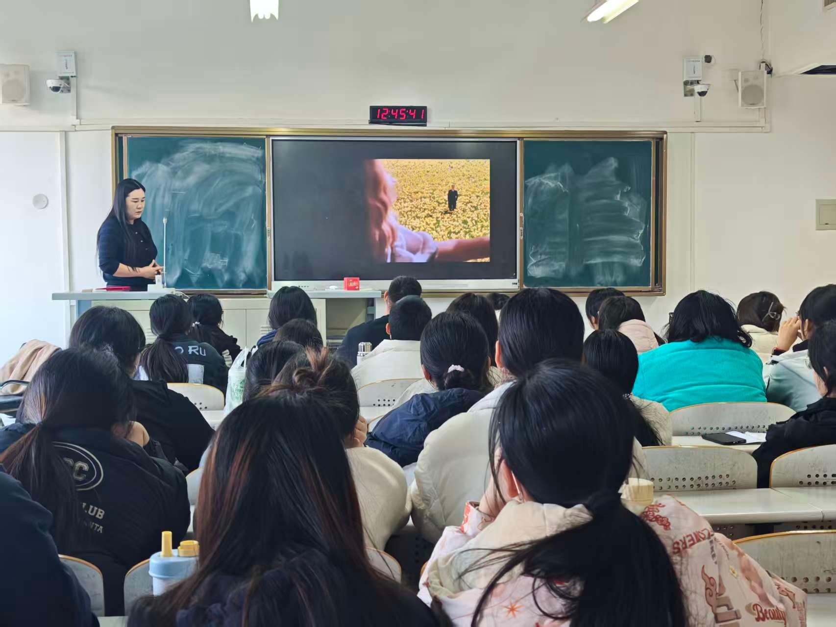 课堂上,袁馨老师从摄影的核心概念切入,用生动的案例和直观的画面演示,为同学们讲解了镜头类型、构图原则、光影运用等基础内容。她结合《影视鉴赏》相关片段,引导同学们观察画面中的景别变化与镜头运动,让抽象的“影像艺术”知识变得可感可学。