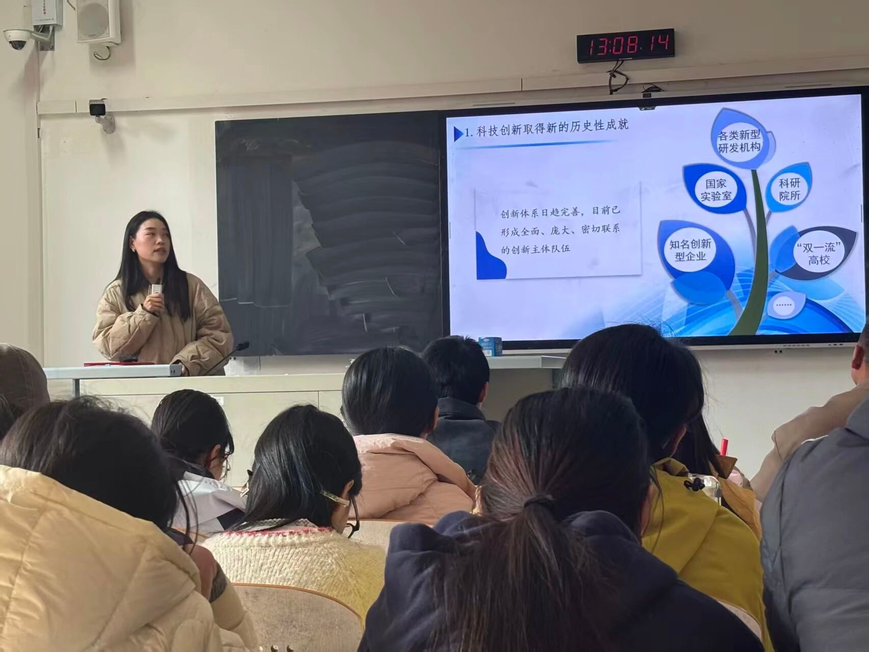 课程围绕“科技自立自强的核心要义”“新时代科技强国的战略纵深”“青年一代的创新担当实践”三个维度逐层展开。课程伊始,吴老师以我国芯片自主研发、“嫦娥”探月等标志性科技突破为实证,系统阐释了高水平科技自立自强“自主可控、安全高效、引领未来”的核心内涵。随后,吴老师结合习近平总书记关于科技创新的重要论述,播放我国科研团队攻坚克难的纪实影像,展现新时代科研工作者“敢啃硬骨头、敢涉深水区”的创新精神。