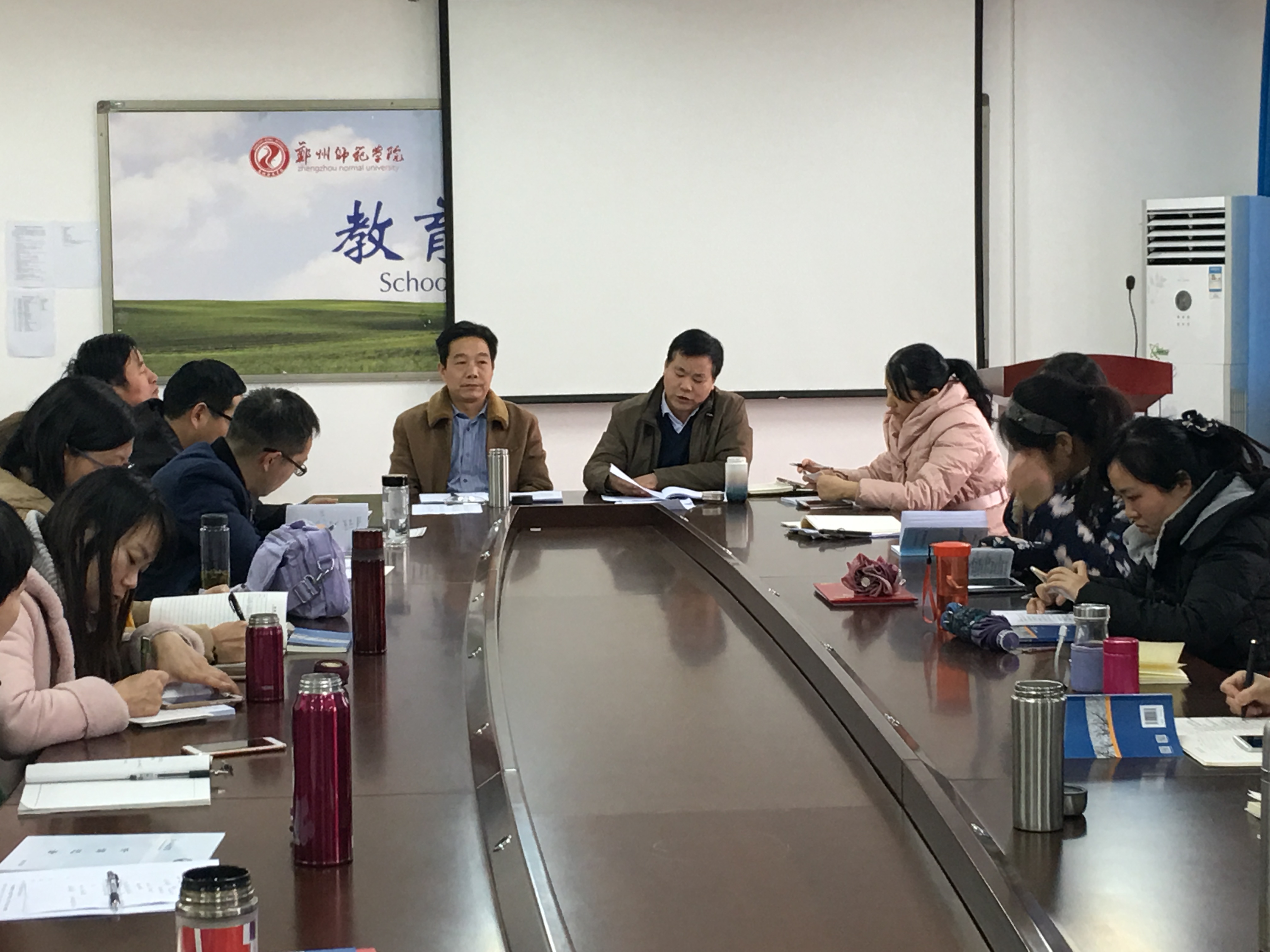 会上,陈院长首先传达了学校干部会议的主要精神,带领全体教职员工认真学习了《郑州师范学院2016-2017学年第二学期工作要点》,其次,结合教学工作会议的具体要求,对开学初教学常规检查工作进行了安排和部署,同时对教学评估、十三五学院发展规划与实验室建设、网站建设等工作进行了具体分工。