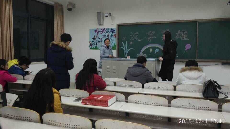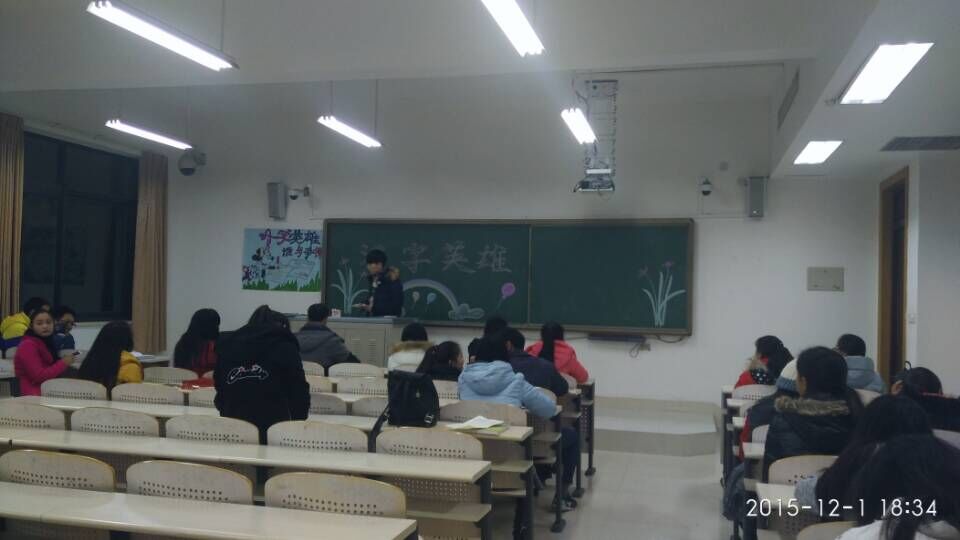 执笔傲视群雄,逐鹿中华汉字。伴着冬雪的消融,“汉字英雄”比赛也在这周二落下帷幕,经过激烈的角逐,我们终于找到了身边名副其实的“汉字英雄”。这次比赛分为淘汰赛和排名赛。淘汰赛于11月26号在C119进行,选手通过简易,中等,较难三个环节进行书写,分数排名前十的进入排名赛。淘汰赛中选手们发挥欠佳,虽是生活中常用字但却不易书写。排名赛于12月1日在C312进行,分为两两对决和抢答两个环节。对决环节中出局的获得三等奖,胜出的进入抢答环节,在抢答环节依据分数评一、二等奖。抢答环节中选手们竞争激烈,正确率很高。观众也积极参与,寻找细微的书写错误。比赛题目贴近生活却不易书写,让大家在游戏中体验提笔忘字的的尴尬和危机感,今后在生活中可以不断学习,不断充实。